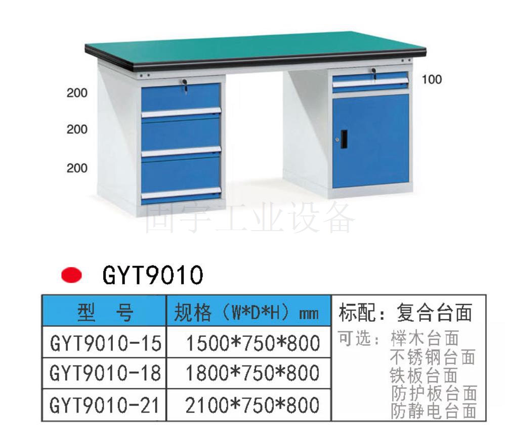 工作臺采用優質冷扎板精工制作而成,堅固的工作桌框架,牢固平穩,可使工作桌承重1000kg;多種工作桌面選擇,可配合不同使用的要求;工具吊柜(箱),側柜(箱)燈架,調節腳杯,,外形美觀;層板,抽屜質量上乘,承重大,抽屜內可根據需要任意分隔;節約空間,適用性強。 范圍 工作臺適合于模具、鉗工、檢測、維修、組裝等各種不同應用場合,具有良好的耐腐蝕性,耐臟性,抗沖擊性和承重能力強。桌面經特殊處理,具有防腐、抗沖擊力強等特點,多種桌面的選擇,可配合不同的使用要求;所配置的抽屜、柜門方便使用者存儲工具;桌角上預留電源孔,方便安裝電源插座。工作臺(桌)分為輕型(可承重300公斤),中型和重型工作臺(桌)可承重1000公斤及特制的工作臺??筛鶕枰`活地配置各種吊柜、單柜、雙柜等,可加裝掛板,電器板,燈頂板、調節腳杯,輪子,擱板等桌上部件,具有多種選擇,能夠滿足各種工位的需求。 工作臺材質采用優質冷軋鋼板,表面采用靜電噴涂處理而制成,堅固的工作桌框架,牢固平穩,可使工作桌臺面均勻承重達到1000kg。桌面有多種材質組成,適用于各行業辦公場所。可配合工具柜,吊柜,掛板,單開門柜使用。抽屜、承辦承重大,性能好,抽屜里可根據需求配置分隔條 工作臺分類:根據臺面的不同分為:櫸木工作臺、鋼板合成工作臺、防靜電工作臺、高分子工作臺;根據承重的不同分為:輕型工作臺、中型工作臺、承重型工作臺;根據功能的不同分為:多功能工作臺、帶吊柜工作臺等等。 臺面優勢 復合臺面特性臺面平整度高,撓曲度為0.8mm。表面2mm厚度為高分子材料,使臺面耐酸堿、耐磨、耐油。臺面采用高壓纖維板,使臺面更具有抗沖擊性。特別的圓弧桌角,不易受撞擊損壞。高強度塑膠包邊堅固、實用、不易損壞、不易脫落。櫸木桌面特性桌板使用櫸木與防水膠經加壓制造而成。表面光滑平整,美觀不易變型,耐油、耐熱、耐酸、耐堿,適合一般工廠作業與精密模具維修,儀器置放與檢測等用途。不銹鋼包面特性桌板使用高壓合成板,表面包1-2mm砂面不銹鋼板,以達美觀耐用。耐高溫、耐磨損、耐油、使用壽命長,為多功能桌板,適合一般工廠、食品業、研究室、電子廠無塵室使用。輕型工作臺可承重300kg-500KG防火板臺面特性輕巧、美觀、耐磨、防火。層壓板臺面特性工作桌面平整,變型小,強度高,抗沖擊性好。 標準顏色 產品顏色 標準的顏色可分為6種:淺藍色(RAL5015), 電腦灰(RAL7035), 機床綠(RAL6011),深藍色(RAL5017)。
